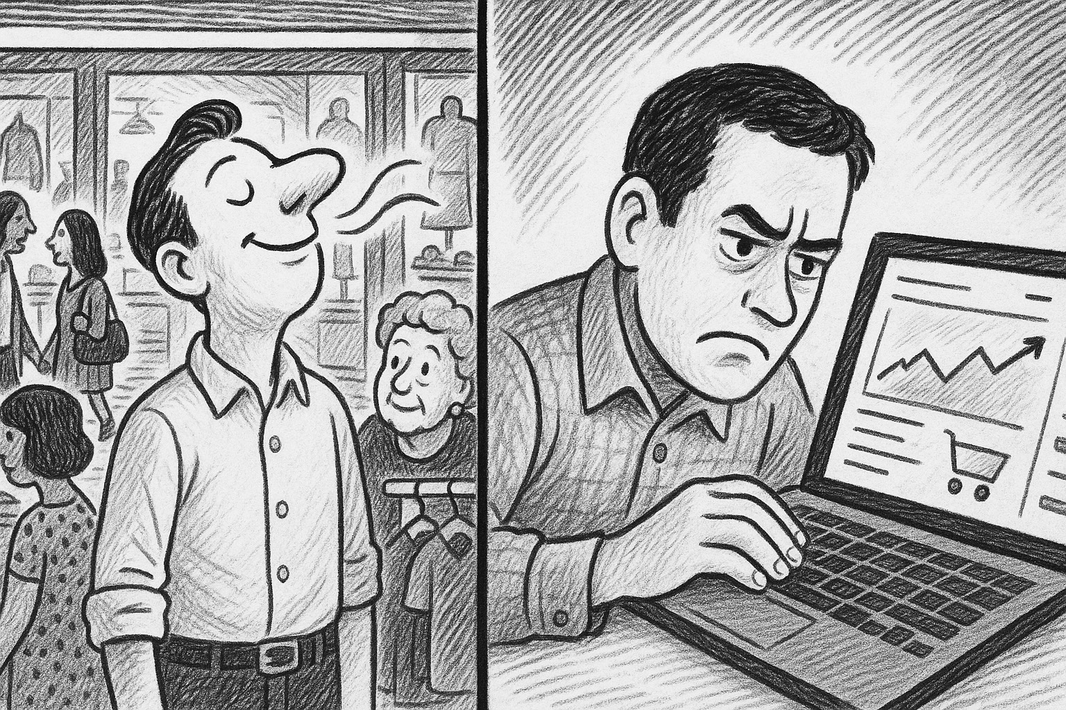 我笑说:其实如果你开线下店,天天看到真实的活的客人,是会有直觉体感的,线上生意接触不太到所以才会重度依赖数据。很多优秀的实体店老板,只要站在那里,就能感觉到客人什么样,喜欢什么。这是线上线下最大的区别之一。