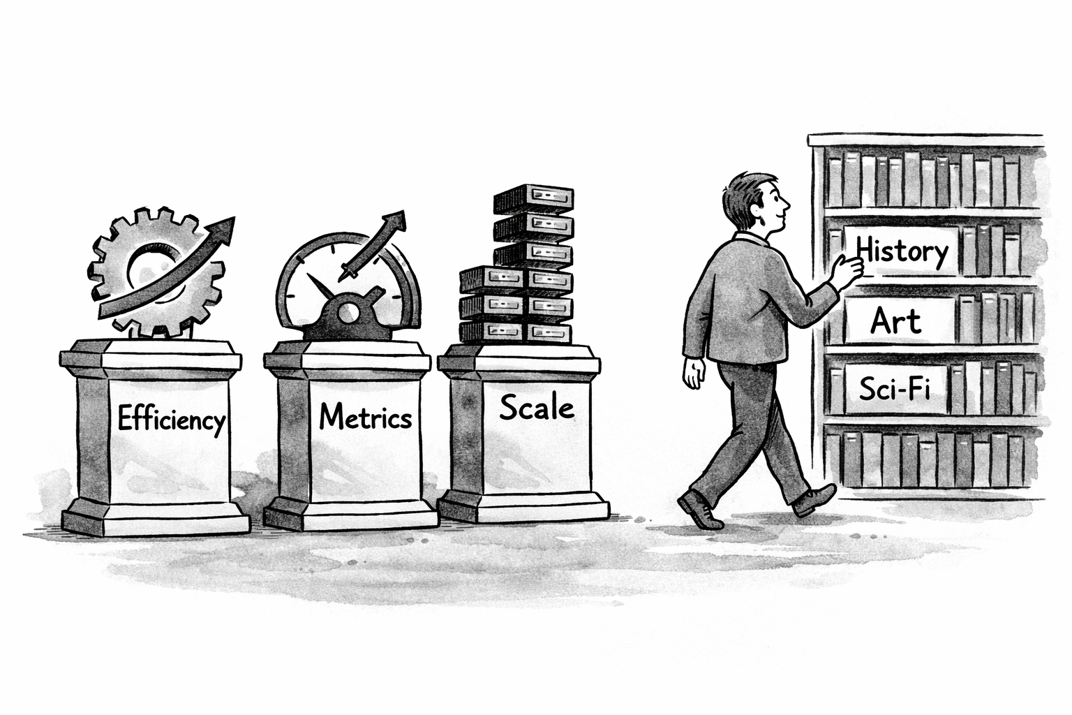 确实是很好的想法!讲的是大家太爱反复强调增长、优化、规模化,这种单一叙事逐渐把世界越走越窄,而解药就在历史、艺术和科幻里。