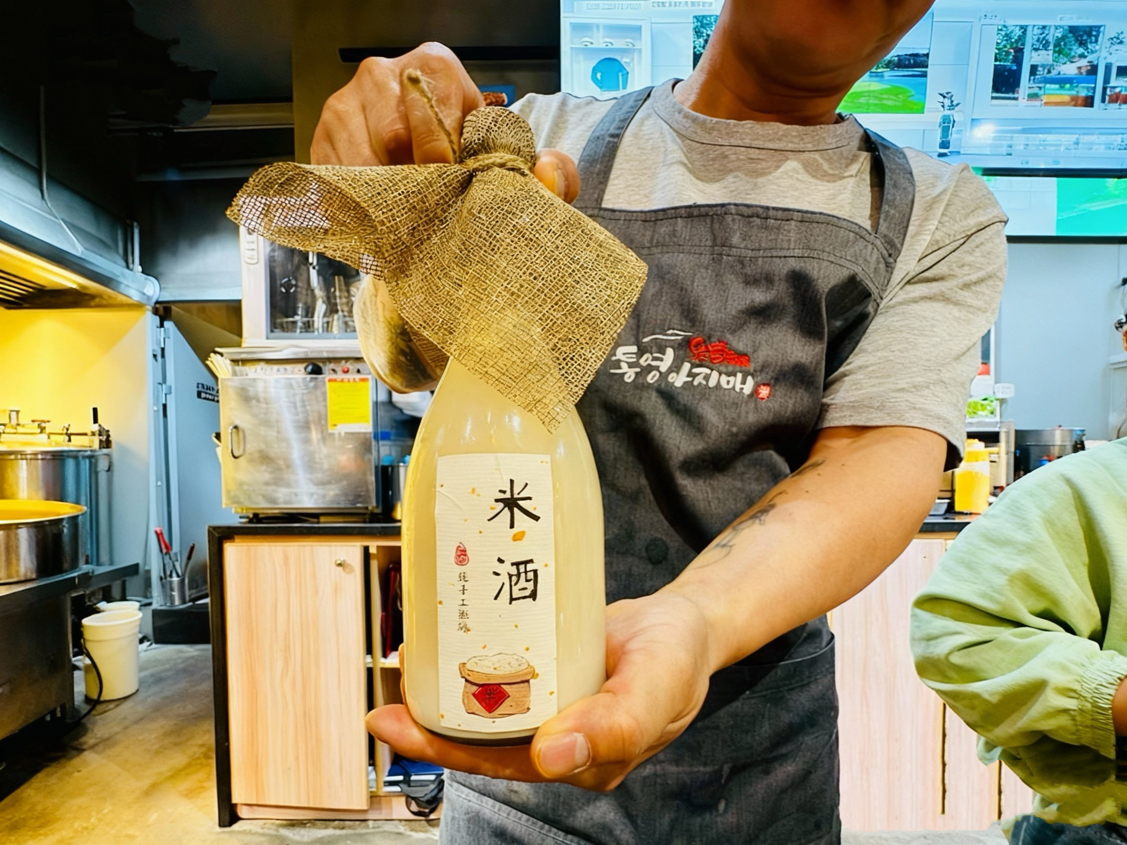 然后老板说:我这个酒和别人不一样,是我奶奶的配方,我们是韩国乡下的,酿酒很好喝!