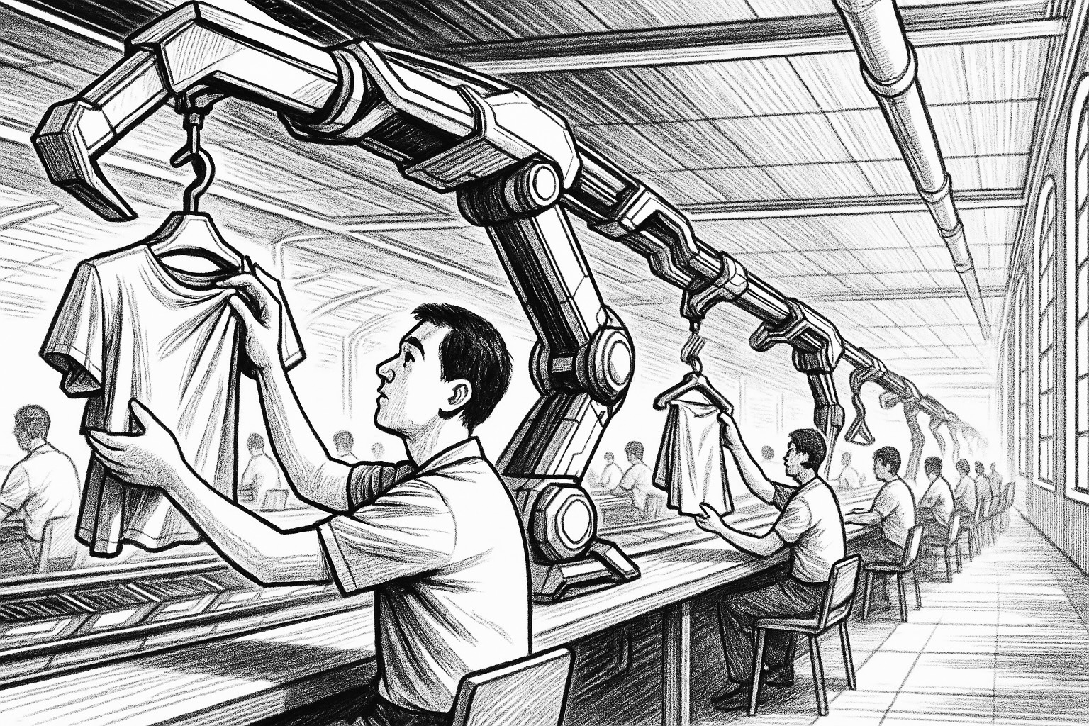 对,某些环节确实是有工人的。那些过于精细的事,比如柔软布料的裁剪缝合和安装吊牌,目前的巨大智能化设备并做不到;质检环节,设备检验之后依然是需要人工复核。