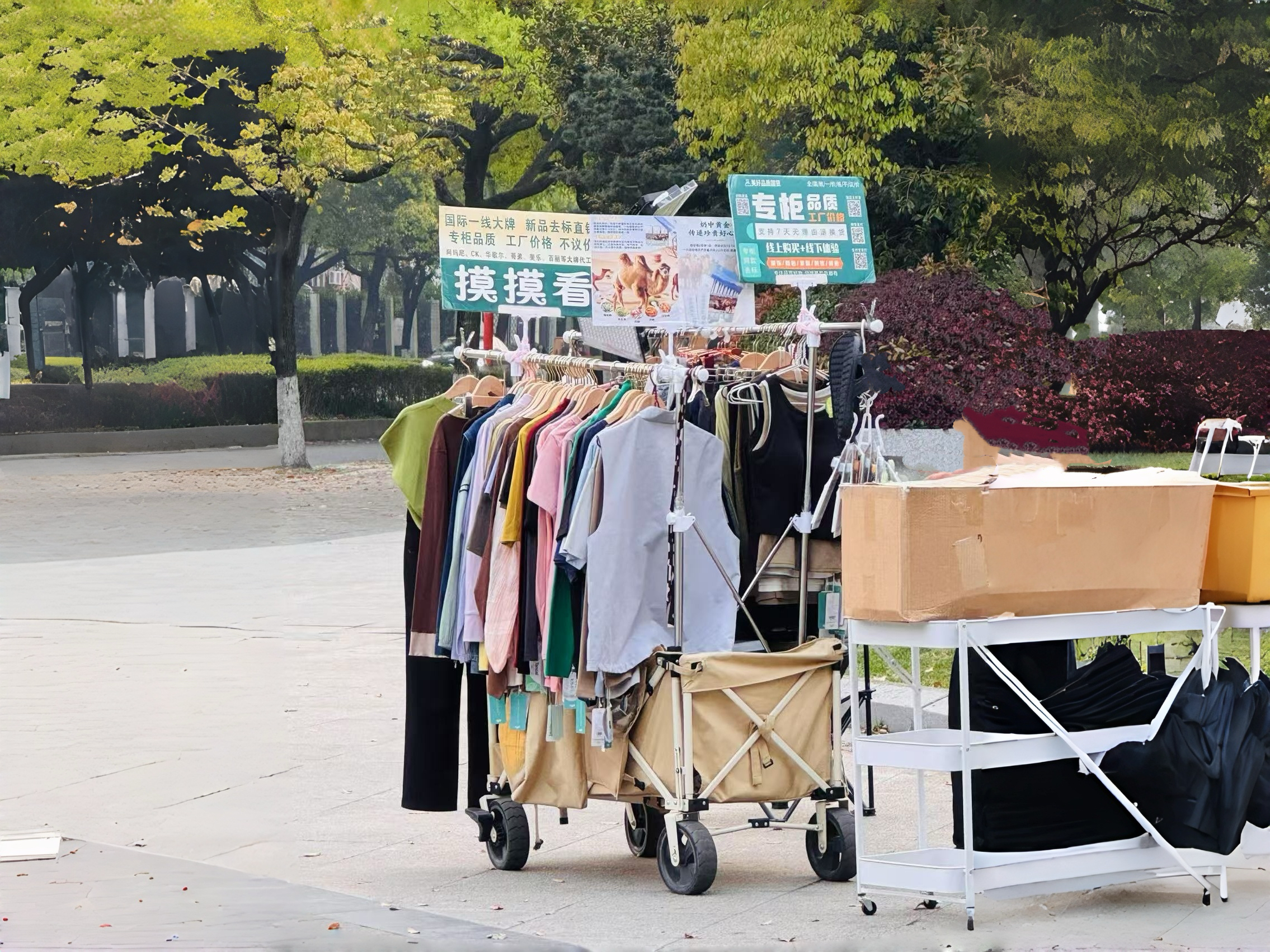 那天等红灯的时候,看到路边有个卖衣服的小摊。看着是哪个小厂的小亲戚拿自家衣服出来卖。露营车支起一个自制的挂衣架,两排衣服,T恤背心之类,上方高高低低竖着几块广告纸牌。