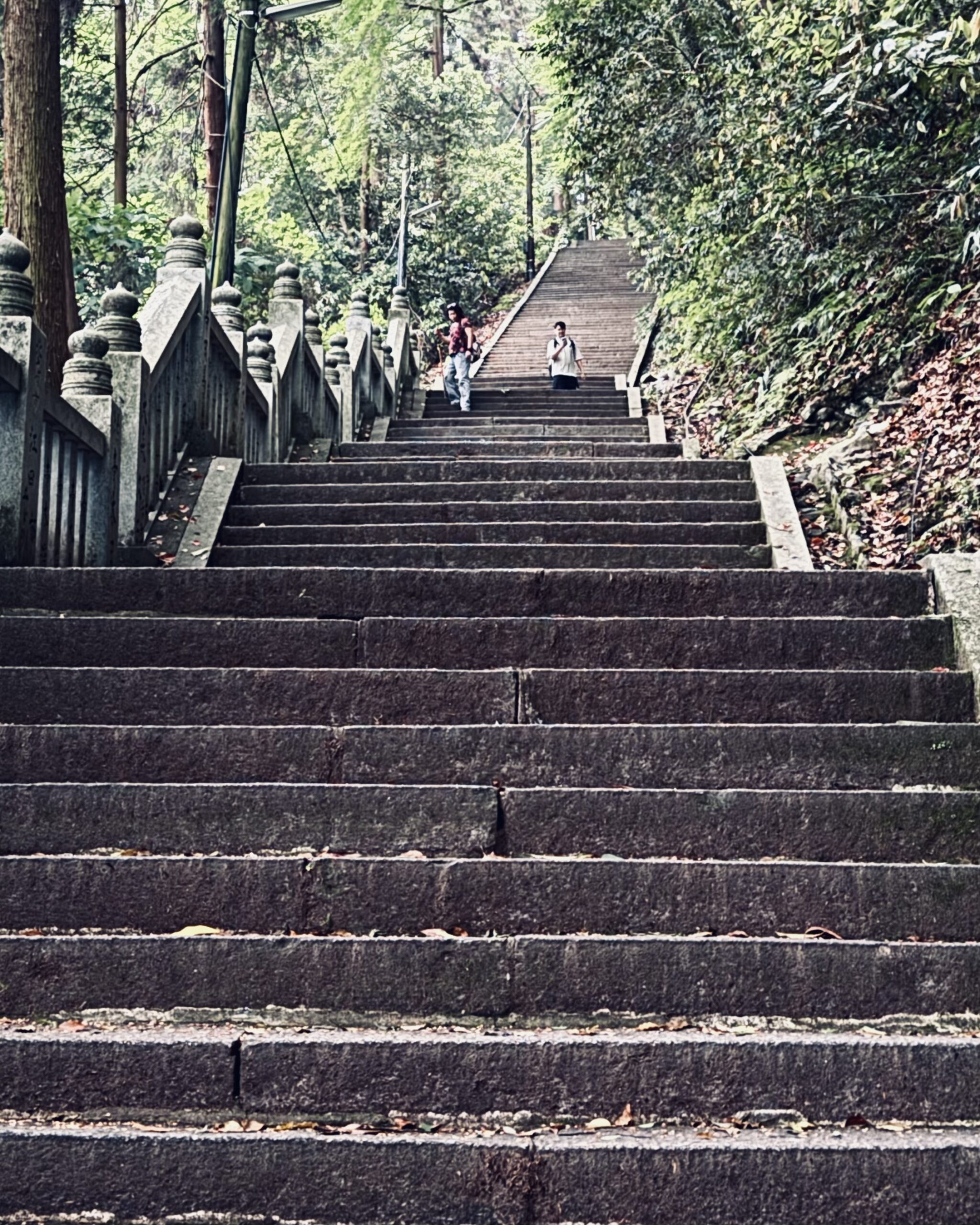 沿着小路继续爬,两边只有遮蔽天空的巨大树木和古老的延绵不绝的台阶,其他什么都没有:没有凳子,没有水,没有服务,甚至也看不到天空,好像与世隔绝一样。这段小路还要爬上和之前差不多的距离,台阶连绵不绝很少停下休息的地方,偶尔有标着距离的木牌给一点希望。零星的同行的人都累得沉默,整段路程就只有你和自己。