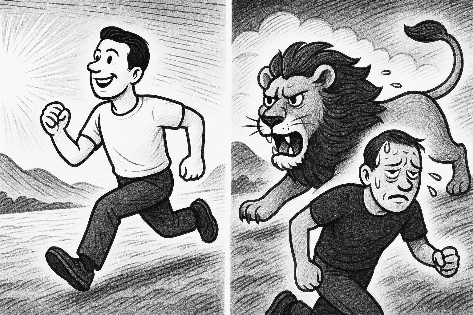 因为被狮子追着跑的时候,很难规划五年十年后的风景。只想着“我今天要活下来”,所以做的每个决策,都是应急的、保命的、不会留下结构性积累。等到狮子走了,很多人也就不跑了,他们甚至会觉得,“原来我没多喜欢创业,我只是害怕被吃掉”。