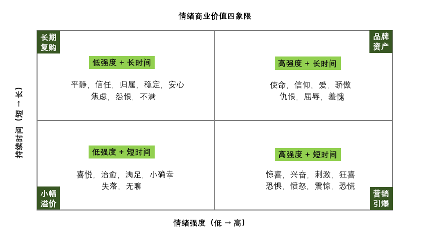 - 低强度+短时间的情绪,包括正面向的喜悦、治愈、满足、小确幸,和负面的失落无聊,在目前的商业运营中最常用到,但小开心只是个基础情绪,意味着其实就只能带来“啊也不太贵那我就买一买吧”的小幅溢价和即时下单,天花板有限;