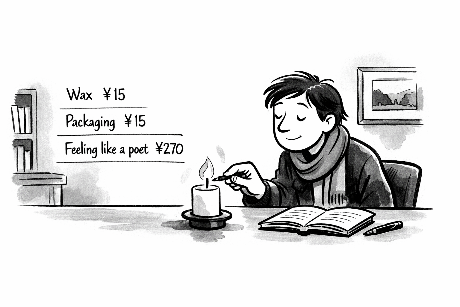 但话说回来,情绪确实是有价值的。比方讲,我最爱买的香薰蜡烛,纯粹图个照明功能的话大概也就值30块,但是它香得冷静又大气啊,包装设计也好看,名字还叫poetic mind,我一点就觉得自己像个诗人,于是愉快地掏了300块 – 情绪价值值270块。